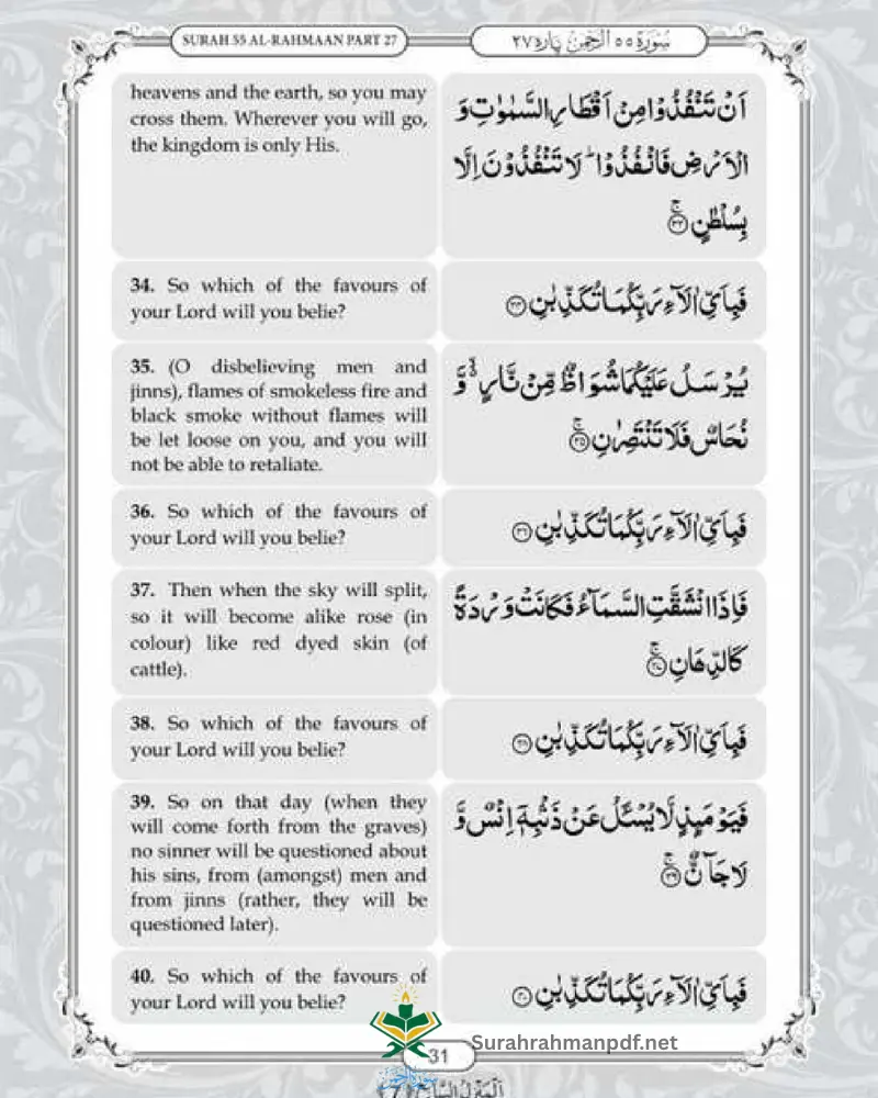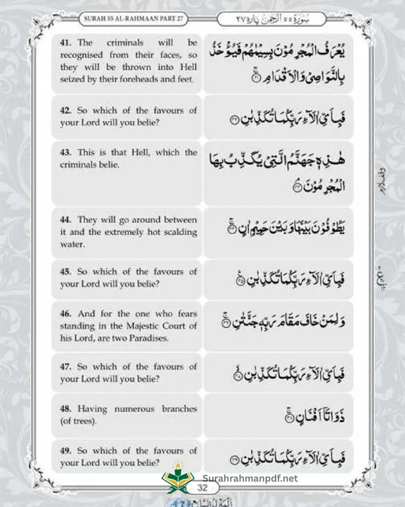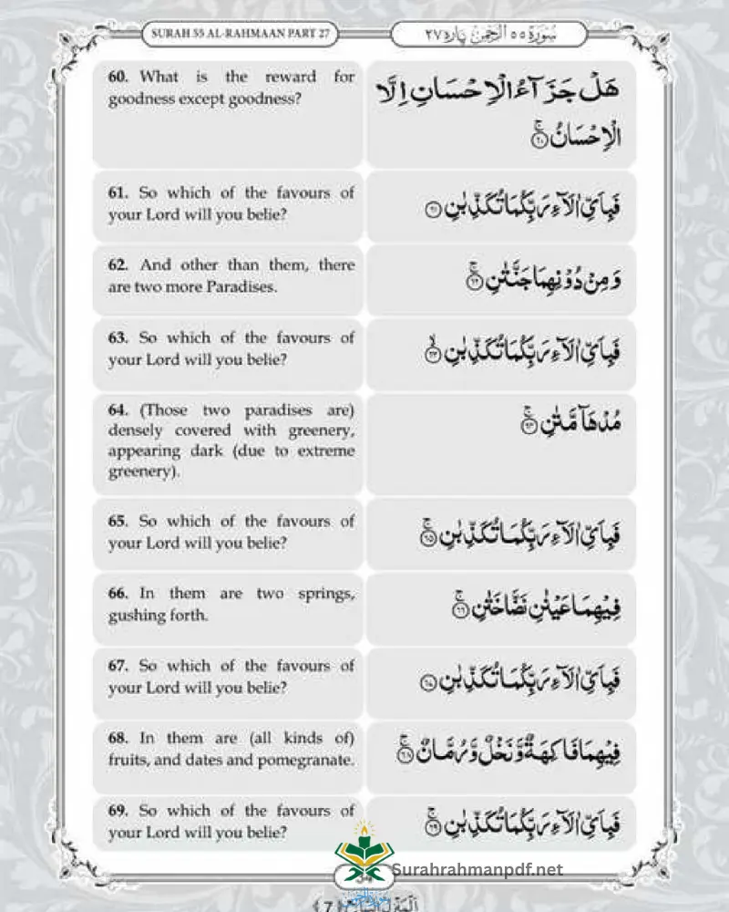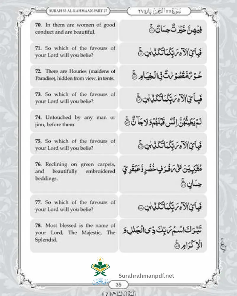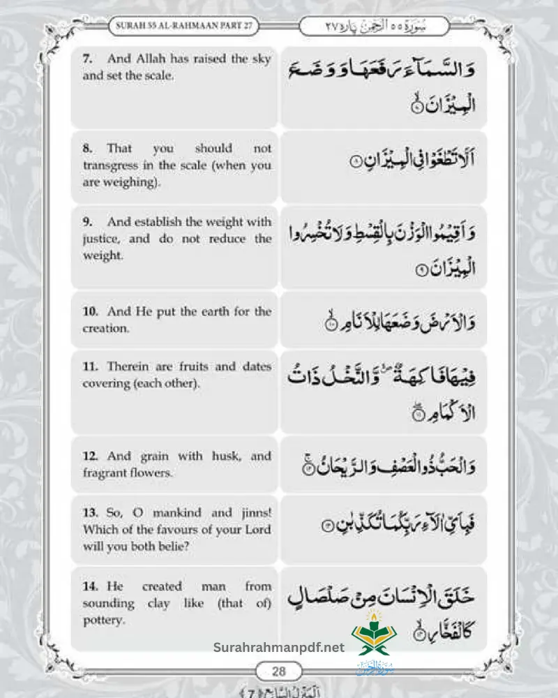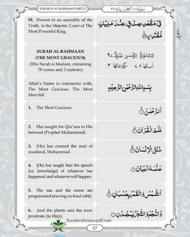 Our website also offers PDF of surah Rehman with English translation.It is completely free and accessable tool for non-Arabic muslims to understand this chapter for enhanced rewards and blessings.Download Surah e Rahman in Englsih and share with your loved one for more community engagement and spreading Islamic teachings.